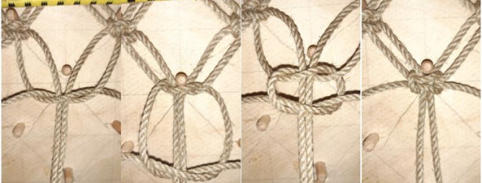 Der Kreuzknoten ist dabei der gebräuchliche Gepäcknetzknoten. Die