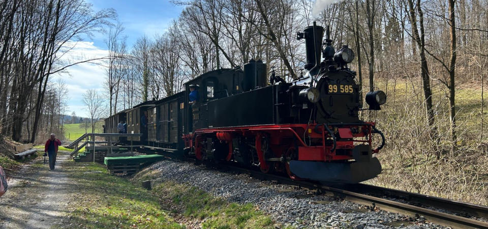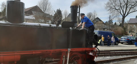 30. und 31. Mai 2026 von 10 bis 17 Uhr Ende Mail laden wir wieder Groß und Klein zu Dampfzugfahrten ein. Am Sonntag feiern wir eine große Kindertagsparty mit Hüpfburg, Kinderschminken und Spielzelt für Geschicklichkeitsspiele, Malen und Seifenblasen. Für das Wohlergehen wird mit Imbissbetrieb, Getränkeversorgung, Kaffee und Kuchen gesorgt. Gegrillte Bratwürste der Fleischerei Hedwigshöhe in Ehrenberg in bewährter Qualität warten auf Gourmet`s. Bei schlechtem Wetter wird unser Zelt beheizt. Das Reservieren von Fahrkarten ist nicht nötig. Fahrkarten erhalten Sie vor Ort zum Preis von 7,50 € Erwachsene ab 15 Jahre / Kinder von 6 bis 14 zahlen 3,50 € Die Mitnahme von Kinderwagen und Rollstühlen (keine elektrischen mangels Heberampe) ist im Zugführerwagen, ohne Ausstieg am Haltepunkt „Glasstrasse“ möglich. Behindertenparkplätze stehen am Bahnhof zur Verfügung.